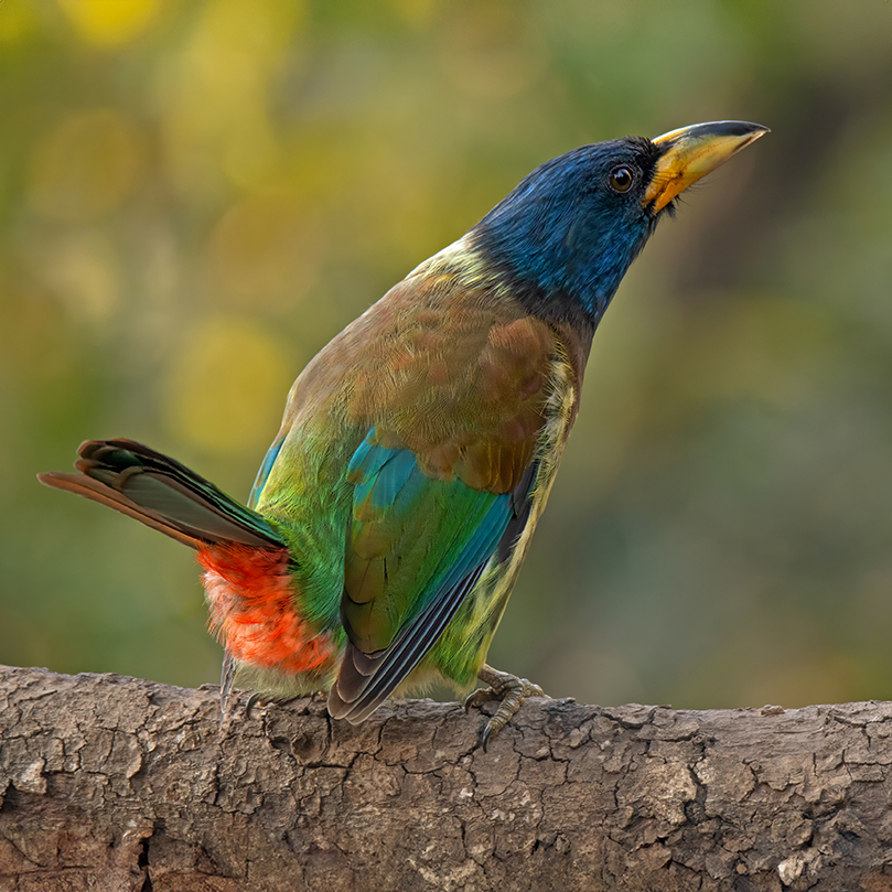 Supongo que el último barbudo de Europa (si los hubo) lo vimos antes de la última glaciación. Llamamos barbudos a un grupo de cuatro familias que agrupan 95 especies esparcidas por todos los trópicos del mundo. Los barbudos están más emparentados con los pícidos (pájaros carpinteros) que con otras familias. El barbudo grande pertenece a Megalaimidae, la familia de los barbudos asiáticos (asia tropical peninsular y sureste asiático). Y es el mayor de todos: 35 cm de punta de pico a punta de cola. Su área de distribución se extiende desde el piedemonte himaláyico del N.E. de Pakistán hasta el sur de China pasando por Nepal, Buthan, Bangladesh, Myanmar, Tailandia, Laos y Vietnam. Vive en bosques templados y subtropicales pero también en arboledas, parques y jardines a entre 0 y 2000 m.s.n.m.