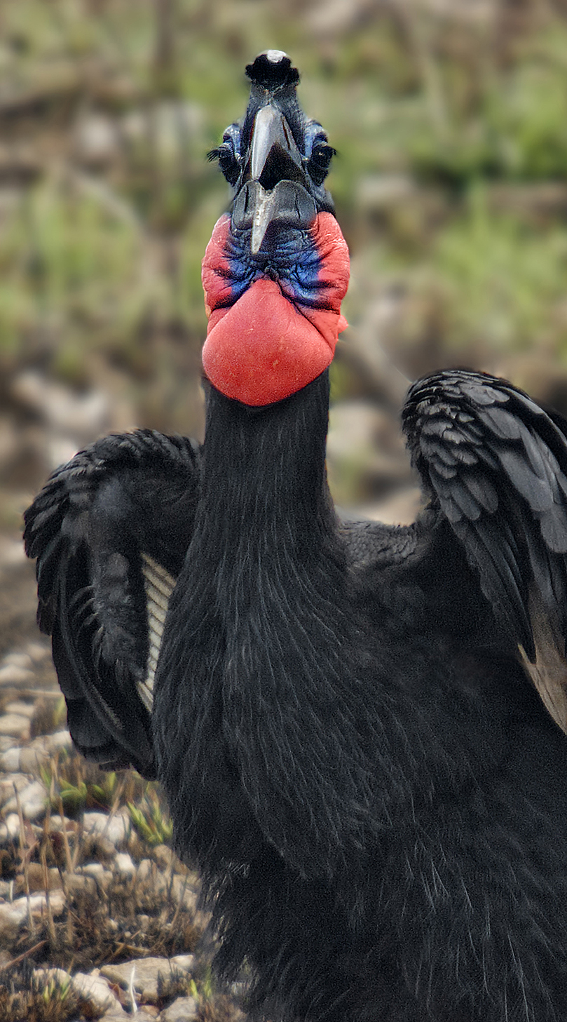 Antaño era la subespecie norteña pero ya hace tiempo que se le considera especie por derecho propio pues ambas solo se solapan (y posiblemente hibridan) en una pequeña región del oeste de Kenia. Además, curiosamente, la piel que rodea el ojo es azul en el caso del cálao terrestre norteño y roja en el cálao terrestre sureño. Así mismo, el saco gular de la hembra del primero es azul (no conseguí ninguna foto) pero rojo en la del segundo. Por lo demás, son muy similares y ambos, solitos, constituyen la familia Bucorvidae, inmediatamente relacionada con Bucerotidae, que es la que reune al resto de tocos y cálaos del mundo, con sus 62 especies.