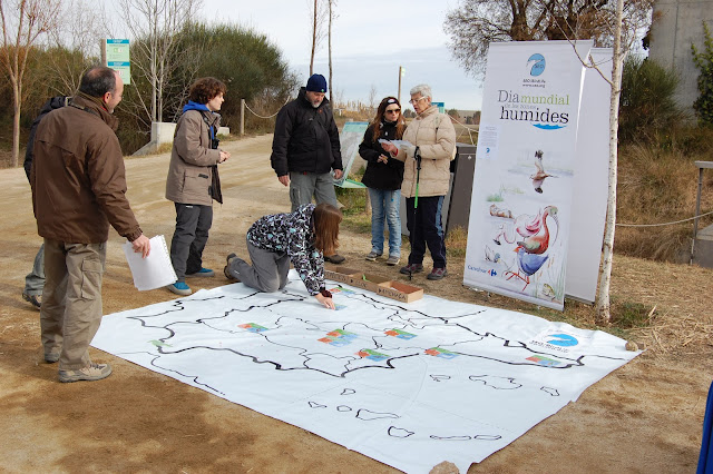 El día 05 de febrero hemos celebrado en la reserva natural del tramo final del río Llobregat, en el Prat de Llobregat, el día mundial de las zonas húmedas que conmemora la firma del Convenio de Ramsar sobre protección de humedales. A pesar del pronóstico que anunciaba la ola de frío polar, a las 9 de la mañana nos encontramos una decena de colegas de SEO en la entrada de la reserva dispuestos a llamar la atención sobre la necesidad de conservar nuestras zonas húmedas, con una temperatura de 2º C pero con un sol fantástico que luego desaparecería para no volver en todo el día. Para la ocasión desde el Grupo Local se había preparado un juego que consistía en un puzzle de 3 piezas para cada humedal RAMSAR de España, formado por el nombre (verde), una especie de ave característica (azul) y una amenaza (naranja) que había que situar en un punto previamente marcado del mapa 3×3 m. de la península e islas. Junto a nosotros estuvieron compartiendo la jornada los compañeros de DEPANA y de ADENA, con los que participamos en la plataforma SOS Delta, informando sobre los problemas que afectan a este maravilloso humedal que se alza como un oasis de biodiversidad al sur de la ciudad de Barcelona.