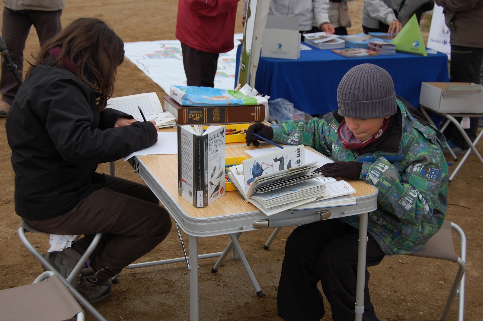 Además a los niños que participaban en la actividad de completar el mapa les pedíamos hacer un dibujo de un ave de las catalogadas en la guía de aves del delta del Llobregat, y a tenor de las imágenes que pusieron mucho interés a pesar del frío que atenazaba sus manos al pintar. Después colgaban las imágenes en un improvisado tendedero para que todos los visitantes las pudiesen observar.
