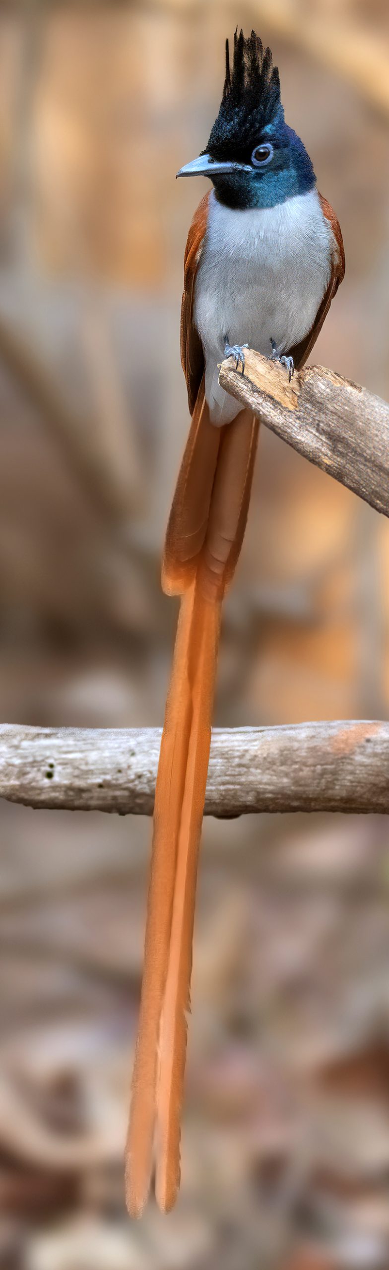 El monarca del paraíso indio pertenece a la familia Monarchidae cuyas muy variadas 105 especies de paseriformes insectívoros se desperdigan por el África subsahariana, Madagascar, el Asia tropical, sureste asiático, Australia, Papua Nueva Guinea y las incontables islas del Océano Pacífico (Polinesia, Melanesia, Micronesia…) El género Terpsiphone agrupa 16 especies, la mayoría de ellas colilargas. En las fotos muestro al macho; la hembra es igual que el ejemplar rojizo pero su cresta es más corta y las dos plumas del centro de la cola tienen la misma longitud que el resto. Solo los machos pueden ser blancos, un rasgo curioso ya que no es raro que una especie tenga varias coloraciones pero que eso se limite a los machos resulta menos frecuente.